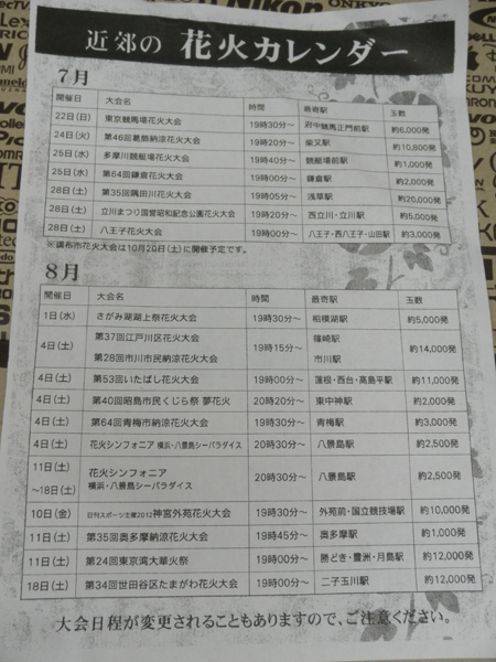 あれ、関戸の花火大会は載ってないのかな?っておもったら、なんか休止中らしい。