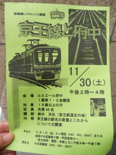 そこの図書館でチラシを見つけたんですけど、「京王線と府中」という図書館主催の講座が