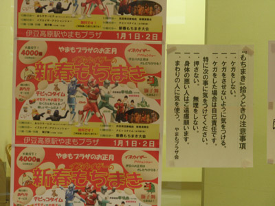 商店のガラス窓に、もちまきにあたっての諸注意が。
