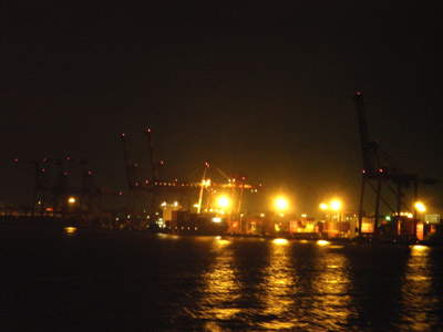 ブラタモリの横浜港湾編でみたような、、貨物船とクレーンたちを海から!