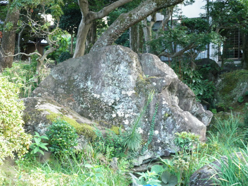 庭の真ん中にある岩は、20トンあるのを十人以上の職人に二ヶ月かけて運ばせたという。
