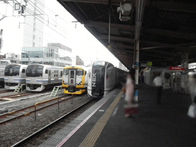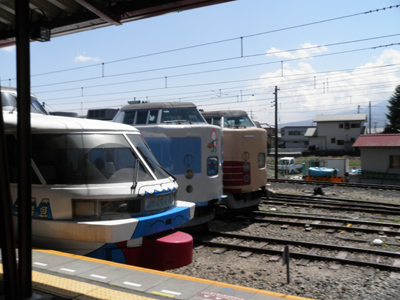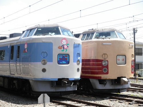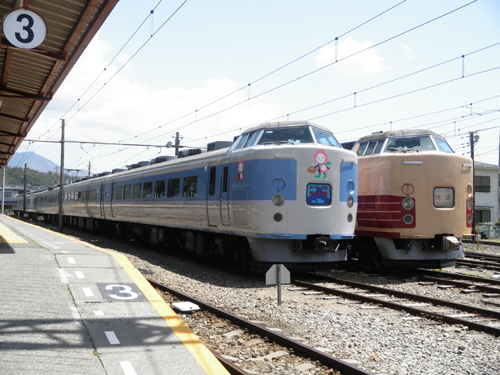 先着していたフジサン特急と、なぜかJRの189系モモずきんちゃんラッピングのあずさカラーと、国鉄カラー。すごい並びだな~