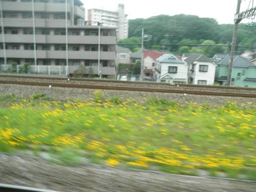 中央分離帯(?)に茎の長いタンポポが生えてキレイでした。