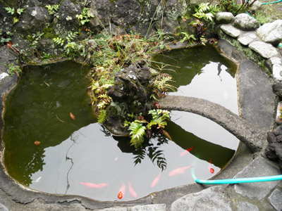 蓮台寺駅着~。蓮台寺はホームに上がる階段と改札の、間にある通路脇に池があります。
