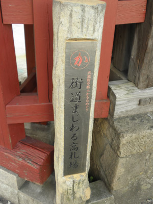 「六所明神さま 暗闇祭りヨ 闇に旅所へ 渡御なさる あれは灯じゃない 空の星 星さえ府中を 出てのぞく」と高札場=御旅所を唄った物が置かれています。神様もお祭りでは移動するルートや泊まる場所がきまっていて、そのポイントをオタビショというらしい。