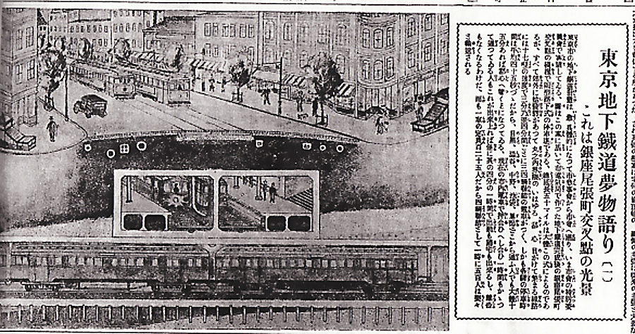 図はこの案に基いて市電気局で作った地下鉄道完成後の銀座尾張町交叉点の模様で函型路下式の停車場である、