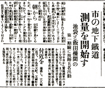 「市の地下鉄道 測量を開始す 池袋と飯田橋間の第一期線に技師五名出勤」