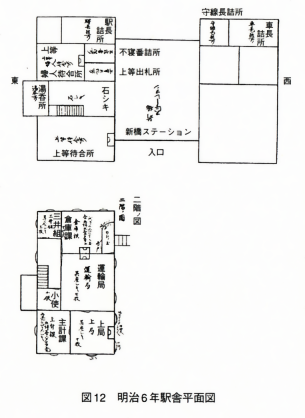 ~(東棟)2階には上局、主計課、運輸局、小使、倉庫課、三井組などの事務所があったことがわかる。(…)西棟の二階に関しては、図そのものがなく用途についてはまったく不明である。しかし、開業前に許可された構内食堂がここに存在した可能性があり、さらに中央の広場に関しても特に記載はないものの、やはり開業前に許可された新聞の販売が(許可されたのは横浜駅もしくは品川駅であろう)、その後新橋駅においても開始されたとしたら、ここで売られていた可能性が考えられる。