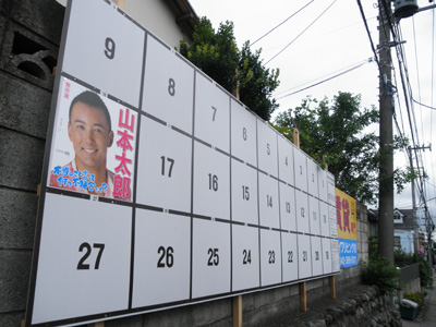 バス停の後ろの塀には参議院選挙の看板。山本太郎さんが仕事が早い。てか選挙区ここだったんだ??