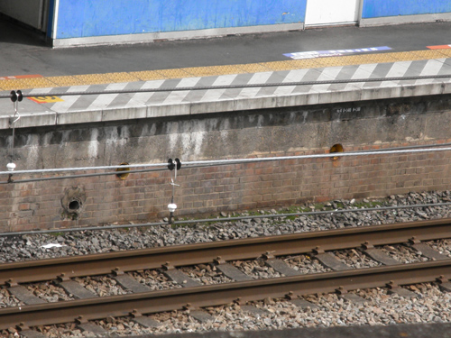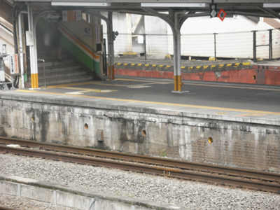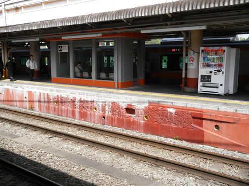 島と対面側の間のホーム下は確かに朱色でした。でも穴とかくぼみは塞いでないみたい。