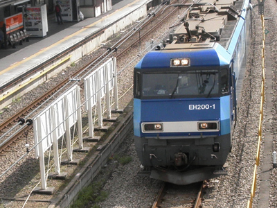 急いで渡り廊下を行っていたら、今度は貨物の機関車が通過。EH200形、しかもファーストナンバーじゃないか?