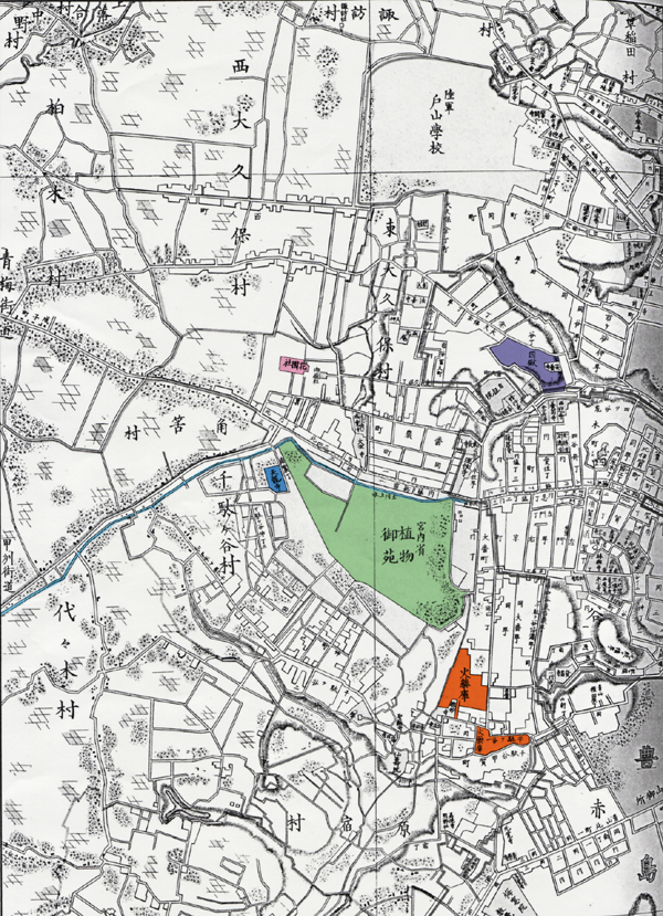 そのさらに北がわには大村子爵の大村邸、東大久保の前田侯爵の前田邸、番衆町の濱野邸があり、