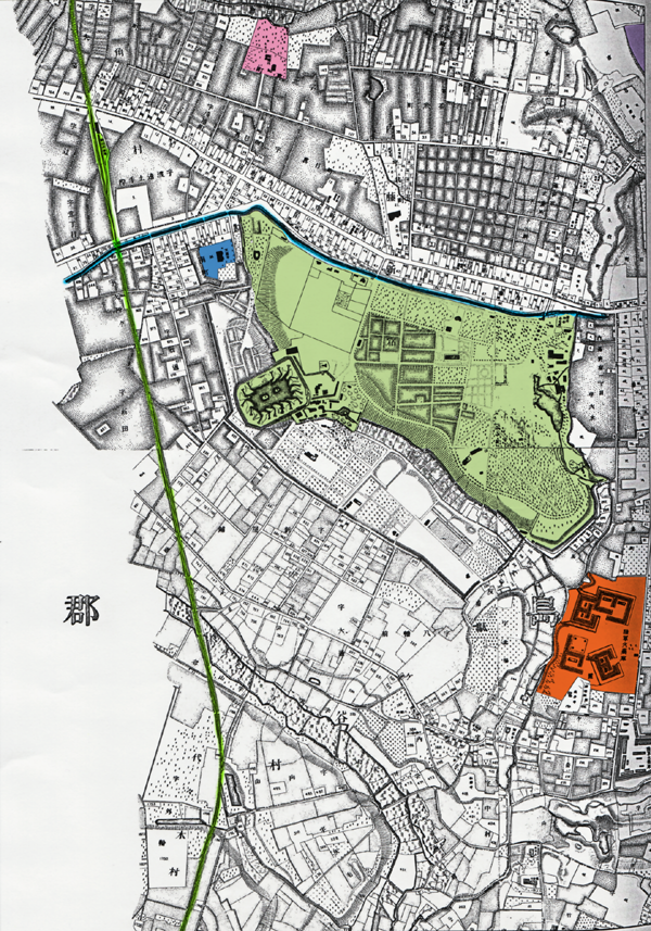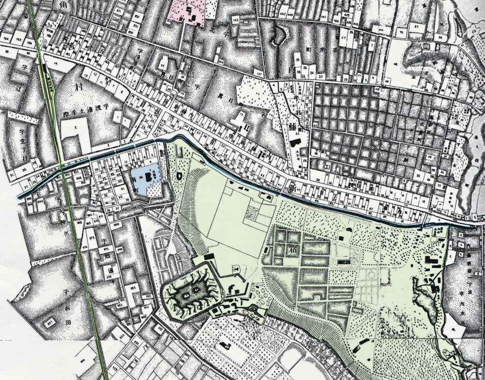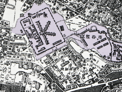 紫の四角い敷地の中に建物が放射状になってる施設です。右隣の「市ヶ谷監獄」はじつは