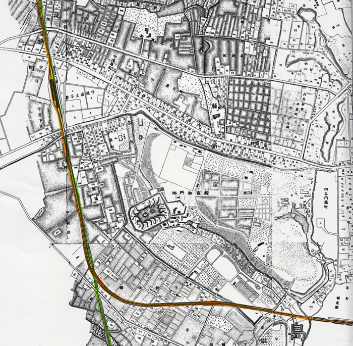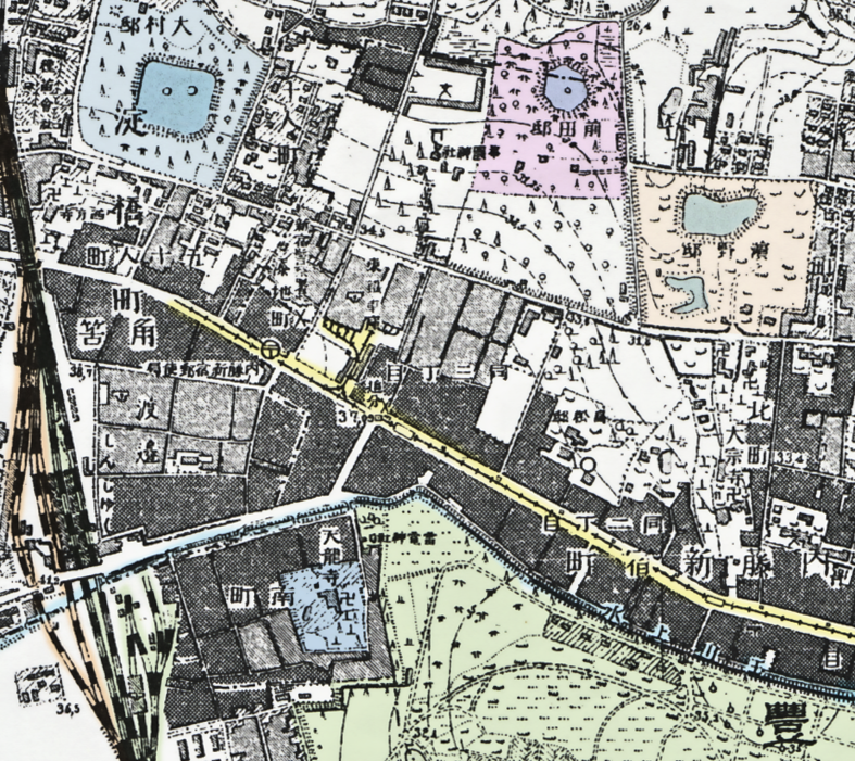 黄色いラインはのちの市電(元・東京市街鉄道→明治39年東京鉄道に)の線路。