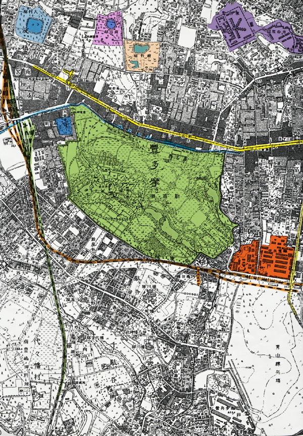 その南側は「青山練兵場」です。そして、そのあいだを中央線が通っています。
