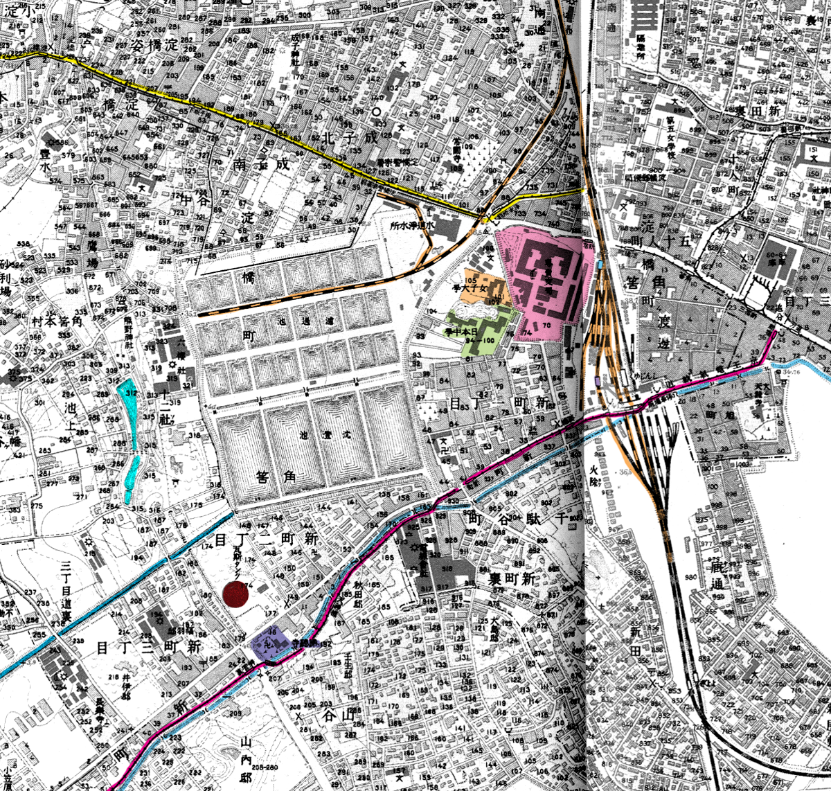 上記のガスタンクが諦聴寺の北側にふえたのがわかります。後年2個目ができます。